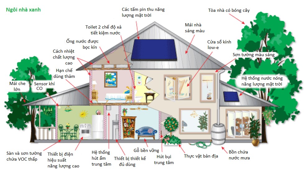 Và sử dụng các thiết bị chiếu sáng tiết kiệm năng lượng như đèn LED, compact… với hệ thống điều khiển thông minh giúp giảm hoặc cắt hẳn lượng chiếu sáng khi không cần thiết bằng các sensor, điều khiển tự động độ sáng của đèn theo ánh sáng ngoài trời hoặc tự tắt đèn khi không có người sử dụng. Tận dụng nước mưa và nước thải từ vòi sen, vòi rửa tay, máy giặt được xử lý và tái sử dụng cũng góp phần tiết kiệm năng lượng. Sử dụng các thiết bị vệ sinh thế hệ mới có thể tiết kiệm được 20% lượng nước sử dụng. Sử dụng bình nước nóng năng lượng mặt trời kết hợp thêm hệ thống đun nóng dùng điện (hoạt động khi trời không nắng). Đồng thời sử dụng thiết bị điều hòa không khí theo công nghệ biến tần inverter kết hợp với điều hòa không khí bằng năng lượng mặt trời; hay hệ thống điều hòa trung tâm với hệ thống cảm ứng tự điều chỉnh nhiệt độ trong phòng phù hợp với nhiệt độ ngoài trời.